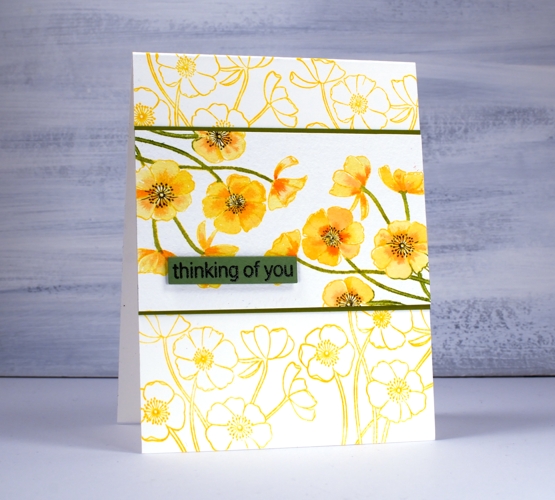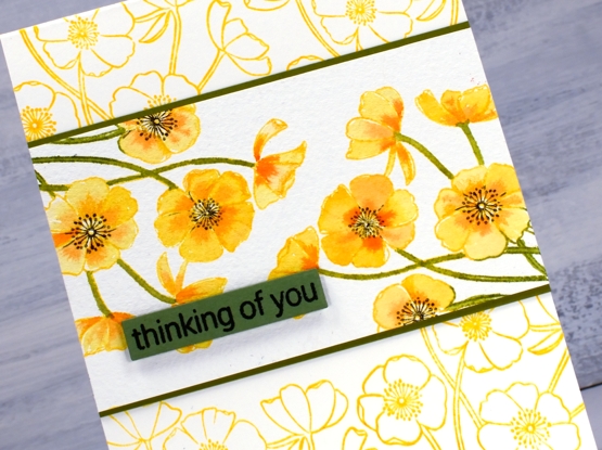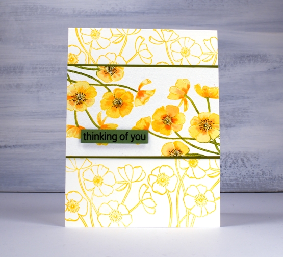 This card is a combination of things I have been meaning to try but hadn’t got around to yet. The sentiment featured on today’s card has popped up on a few projects already; I like the size and clean font. Each time I’ve used it I have thought, ‘I must use the flower stamp some time’. Today’s the day. The set is from Penny Black and it’s called ‘wildflowers’; it’s a mini set made up of one floral stamp and one sentiment, both featured on this card.