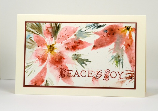 The panel started out bigger than this with a third shadowy flower at the bottom. I stamped the sentiment in crimson red versafine ink because the stamp has those nice little details and versafine does a great job with them. Versafine also takes longer to dry than dye ink so it is important to walk away, just walk away and let it dry! I didn’t. To my credit I managed to get the whole card stuck together without smudging the wet sentiment only to swipe my fingers right through it when I folded the card base in half at the end!