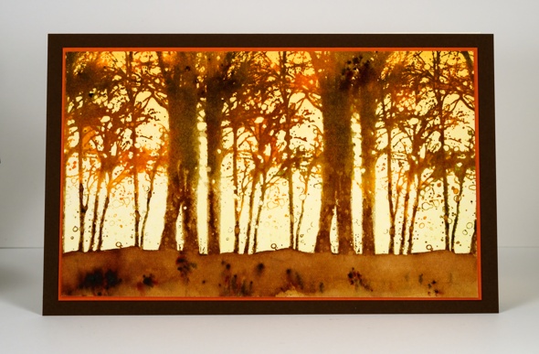 Posted: September 7, 2015 Filed under: Bister, Snowy Grove | Tags: Bister, Canson watercolour paper, Penny Black stamps, Ranger Distress inks, Ranger Distress stains, Tsukineko Memento inks 14 CommentsSnowy Grove (used on the card above) is one of my favourite stamps from the new PB release. I have already used it for a fall and a winter look and plan to include it in one of my upcoming Christmas card classes. To create this scene I created the soft gradation of colour behind the trees first by brayering memento dandelion ink over the bottom half of the panel and memento cantaloupe ink over the top half. I then inked the stamp with forest moss, gathered twigs and dried marigold distress inks and stamped. For the more watery blended look I inked the stamp again with vintage photo and spiced marmalade distress stains and stamped a second time (with the help of the misti). Because the stains sit on the paper for a while without soaking in I was able to grab a paintbrush and paint over the large trunks to fill in the empty circles that suggest snow. I pulled some of the stain down into the ‘ground’ area and, with some extra stain, filled the forest floor with brown stain then sprinkled some brown bister powder over the panel for extra texture.