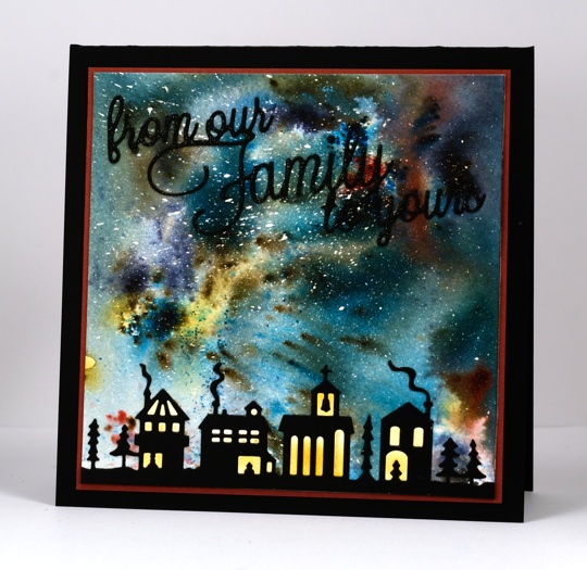 This little town die is the cutest thing and fitted nicely below my dramatic bister sky. I sprinkled bister over a panel of watercolour paper which already had masking fluid splattered on it. Next I spritzed with water and let the magic happen. I wanted a warm light to shine out of all those tiny windows so I die cut another little town from watercolour paper and sponged colour onto most of the window pieces and slotted them into the spaces. I am thinking this one might make it into one of my Christmas classes. It is not obvious in the photo but there is a little sparkle on that sentiment die.