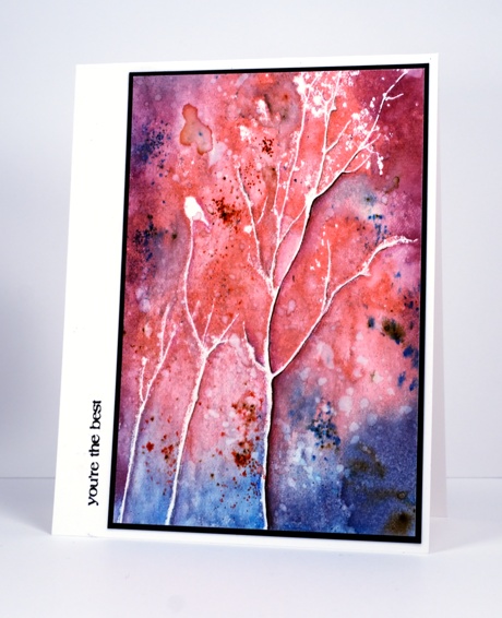 Penny Black has several negative space stamps in the new release which are fun to work with. Working with this one called ‘Astral’, I decided I wanted several colours behind the bright white bird and tree so built them up in several stages. I used the MISTI and stamped in a pale blue ink first. I inked the stamp again, this time with darker blues and purples then spritzed it lightly with a pearl-ex spray so the colours would blend a little and have some shimmer when stamped. I also spritzed the stamped panel so I could drop some mahogany bister in a few places. Finally I added some water droplets and dabbed them up straight away to create pale circles.