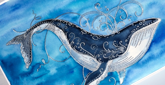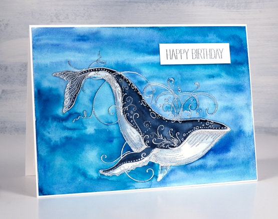 For this card I embossed with Brutus Monroe sterling embossing powder on hot pressed watercolour paper then painted with Sennelier watercolour paints. I painted the water first with a mix of blues, then the whale with my darkest blue mixed with some Paynes grey to darken it even further.
