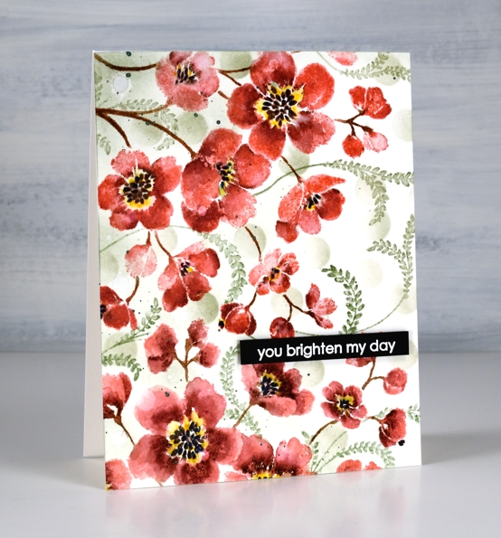 To add filler around the red blooms I stamped the fronds from the PB ‘branches of love’ set in bundled sage ink then blended over them with a paintbrush and minimal water. I also used a blending brush to blend some bundled sage circles through the PB ‘dotlets’ stencil. I splattered some moss green pearlescent paint then popped up an embossed sentiment to finish the card.