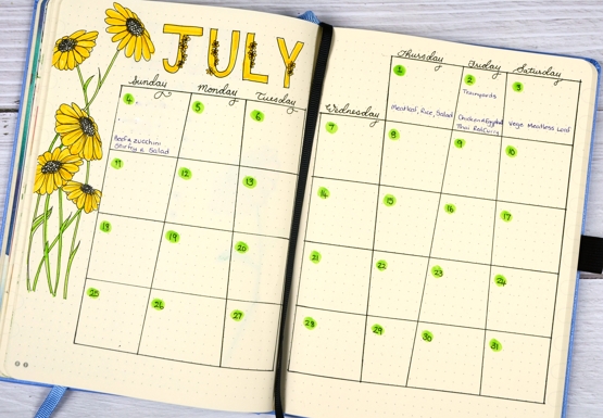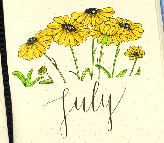 As I did the last two months I used markers to colour the flowers and butterflies; I am still new to (non-blended) colouring with markers. Usually when I use markers for colouring I add a little ink then blend it with water to fill a space. As the bullet journal pages do not handle water in the same way as watercolour paper I’ve avoided water blending.