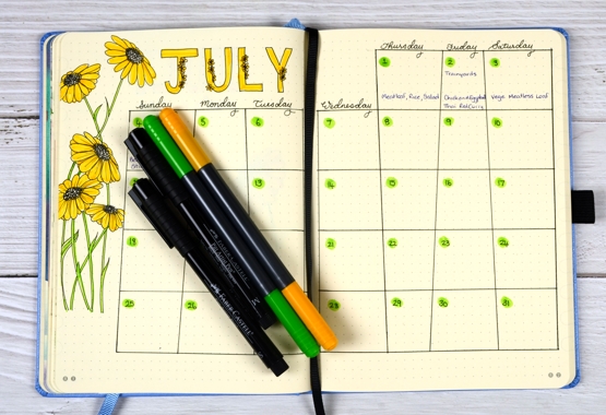 For the calendar page I stamped the same grass stamp in a different colour for each week day and added coordinating labels at the top of each column.
