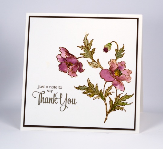Posted: February 21, 2016 Filed under: Gentle Day, Playful | Tags: CAS, Penny Black stamps, Ranger Distress stains, Tsukineko Versafine inks 12 CommentsPoppies and roses feature (of course) in the latest release from Penny Black. Poppies are a favourite flower of mine but then so are roses and tulips and of course daffodils and I can’t forget sweet little pansies or gorgeous blue cornflowers. The poppies above have a matching die. I once again stamped in watersoluble brown ink so I could blend it with the pink and green stains I painted into the outline image.