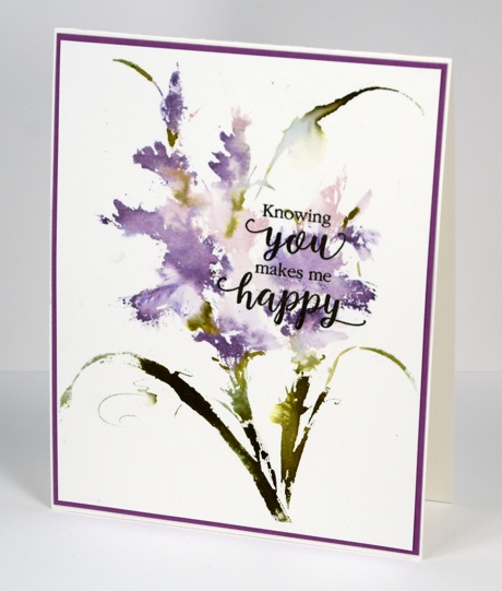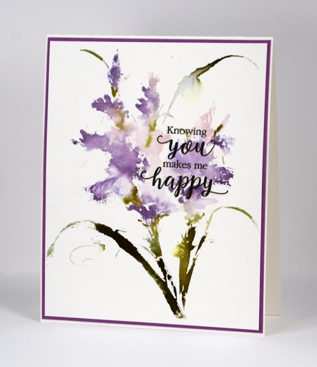 I have tried two colour schemes with this large floral cling stamp. Today’s colours are similar to the irises I have in my own garden. (I’ll share the other colour scheme another day) The cards above and below are not that different but I wanted to show you yet another reason I love to stamp with distress stains. Inking the stamp directly with distress stains makes it quite wet so a second or third impression usually creates a couple of similar but softer images. The ‘knowing you makes me happy’ card above is the first impression inked with two purple and two green distress stains. I sprinkled a little water on the paper before I stamped so the colour would bleed more in some places than others. I added a bit more definition with a watercolour pencil and painted some green stain on the stems in the centre of the image where they were not distinct enough.