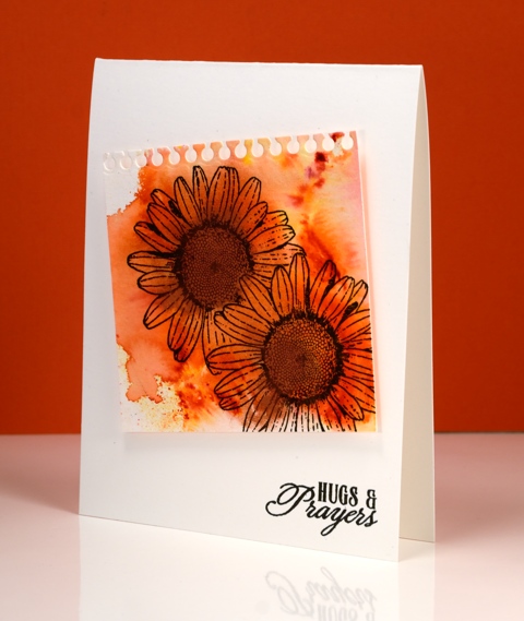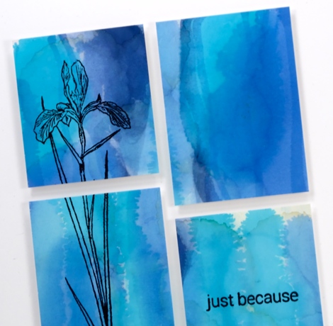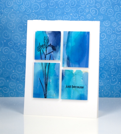 Even though I love watercolour and the image above is full of lovely soft blends and bleeds I chose to use my recent arty crush, alcohol inks. I dropped sunshine yellow, pool, raspberry and juniper one colour at a time so I could squirt air at each drop before it dried. You can see how some inks create a new colour when they intersect but others cover or push the other colour. I matted in black and attached my panel to the card base askew before adding a die cut sentiment.