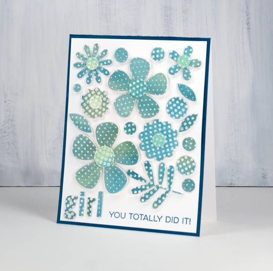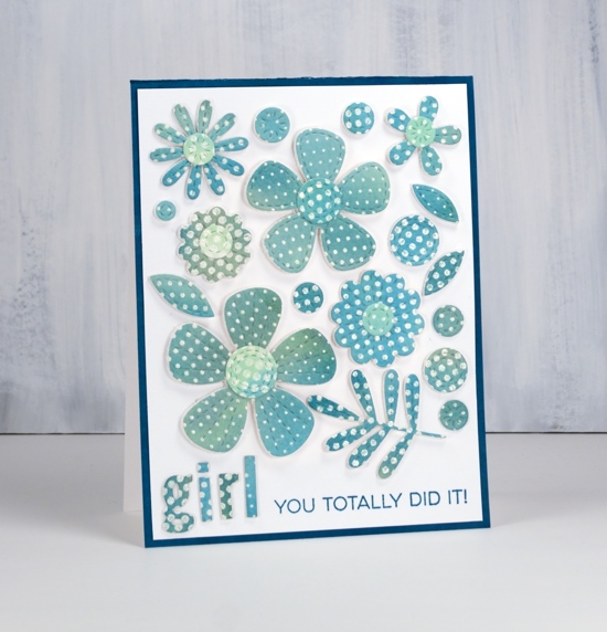 I love the dimension of the foam backed elements on this card and the teal/blue colour scheme; it pleases my matchy-matchy heart.