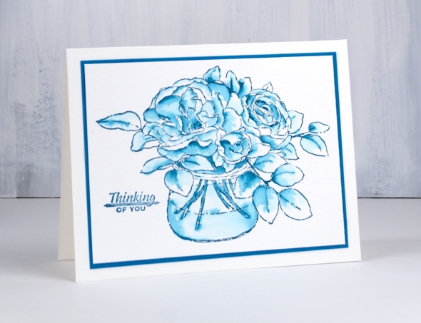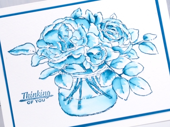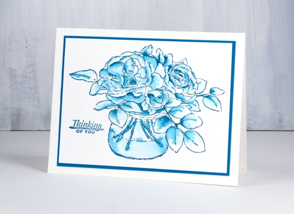 Not sure why I chose to stamp roses in blue to start off with but there they are. I added a sentiment from a set of tiny sentiments, matted in a matching cardstock and ended up with a simple watercolour design. You’ve probably gathered I’ll be using this technique with CP inks again.