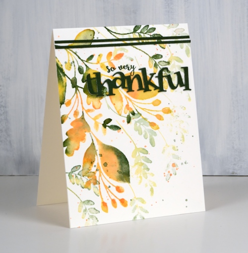 To create today’s gratitude themed card I used a Penny Black Christmas set. The only part of the set that is particularly Christmassy is the bauble hanging on one of the branches. I left that stamp out and used the other two that feature only leaves and berries. I used autumn tones too, three Catherine Pooler inks: spruce, bellini, shea butter. I started by inking the larger of the two stamps in shea butter ink then dabbed some spruce and bellini here and there on the leaves and berries. I spritzed the stamp with water then stamped on hot pressed watercolour paper. The inks had begun to blend after spritzing; I blended them more on the paper with a paintbrush. While there was still ink on the stamp I spritzed it and stamped again resulting in a paler image. I blended the pale leaves and berries with a brush too. I repeated the process with the large stamp then did the same thing with the small stamp and ended up filling 75% of the panel. You could leave the blending step out, I just like to get the look of painted leaves.