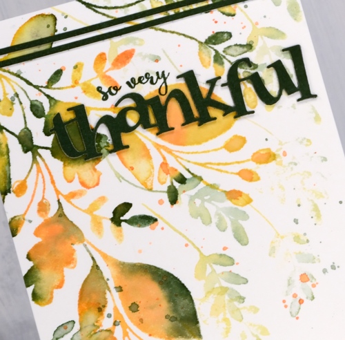 I did a little splatter in both spruce and bellini then moved on to the sentiment. To make sure my die cut sentiment and accent strips matched exactly I swiped the spruce inkpad onto some watercolour paper then let it dry. The CP inks are very juicy and gave great coverage. I added double sided adhesive to the back of the spruce coloured watercolour paper then die cut the word ‘thankful’ twice. The die is ‘thankful heart’ combined but I did a little surgery and removed the heart. I layered the two die cuts then worked out where I would put them on my leaf panel. There was an area where the ink and water had splodged so that was the perfect area to cover up with a sentiment. As I was using some stamped words right up next to the die-cut words I did the stamping first in my positioner so I wouldn’t have to try stamping around die-cuts already stuck down! I wonder how I knew to do that?! The stamped words are half a phrase from the very useful ‘happy snippets’ set.