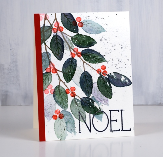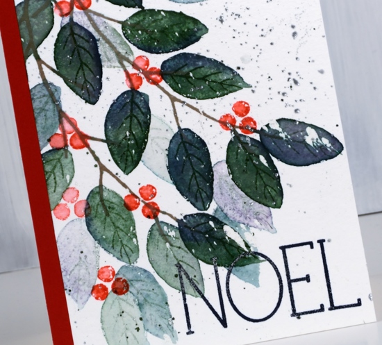 I used Catherine Pooler inks on the ‘tweet wreath’ from Penny Black. In the stamp positioner I dabbed a green ink on the wreath, spritzed it lightly with water, stamped then dabbed a different green in random places and repeated until the wreath was all green. I dried the watercolour panel and cleaned the stamp before inking the outline leaves and berries with a versamark pen. I stamped again and embossed the versamarked lines with gold embossing powder.