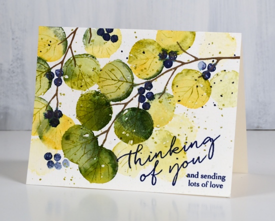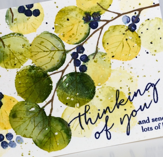 I dried the panel before adding the berries in CP juniper mist ink and blended them with water also. To finish the design I splattered some green tea and juniper mist inks over the panel but then noticed a leaf vein stamp in the set, designed to go with the round leaf. I didn’t want the veins to dominate the design so I stamped them in green tea and re-stamped without re-inking to get even paler impressions. The last thing I did was add a sentiment from the same set in versafine majestic blue ink.
