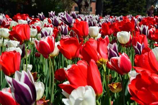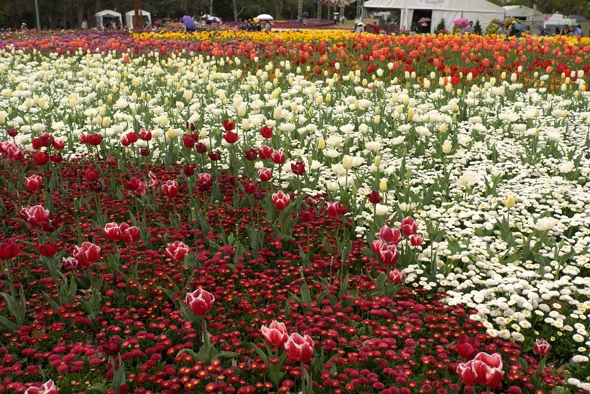 Although much snow has disappeared this week there are not many signs of life in my garden, definitely no tulips yet. I will look forward to the real ones while I create gardens with the stamped ones! Here in Ottawa we enjoy the Tulip Festival each May and in Canberra where I lived for many years, Floriade is held each September. Both festivals feature massed flowers some in blocks of colour, others mixed like confetti. It was the blocks of coloured tulips that inspired this card. I’ve added a photo from each festival below.