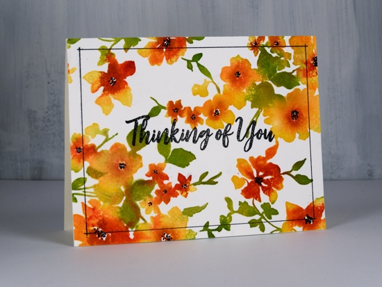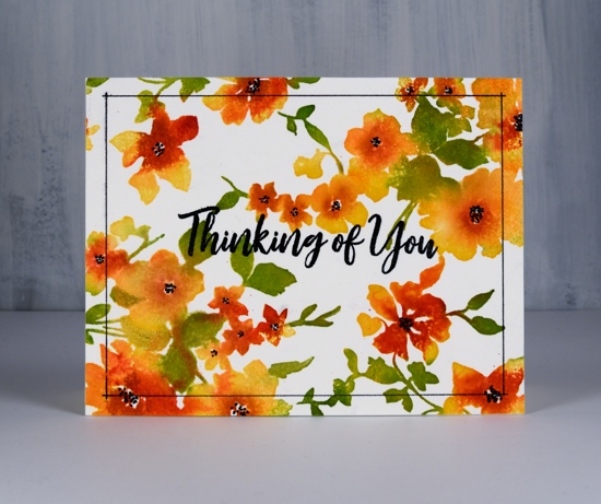 Posted: June 7, 2019 Filed under: Catherine Pooler inks, floral background, My Favorite Things, The Stamp Market | Tags: Catherine Pooler inks, My Favorite Things, The Stamp Market 8 CommentsI’m still in yellow-orange-red mode, quite unusual for me. I can assure you the blues and pinks will return! I’ve been wanting to ink up the lovely floral background from The Stamp Market again ever since I gave it the rainbow treatment. With the stamp in the MISTI I stamped first with Catherine Pooler shea butter ink on hot pressed watercolour paper. Next I did partial inking with CP samba ink. As you can see I wasn’t particularly accurate with the second colour but I did try to apply it to flowers not leaves. I spritzed the stamp and stamped again. I switched over to leaves and inked them with CP eucalyptus ink, spritzed and stamped again.