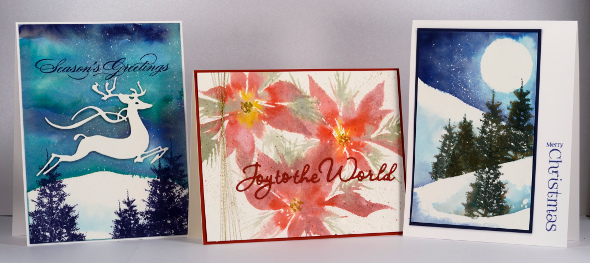 Posted: December 13, 2016 Filed under: Classes, Stamped Landscapes, Woodland Beauty | Tags: Classes, Penny Black stamps 15 CommentsI recently taught a card class where we created Christmas cards featuring the northern lights over snowy landscapes. Everyone’s scenes looked different as there was a variety of inks to choose from. Back in the planning stage for the class I created a few different scenes as I worked out what would work in a class setting. (I have to make sure I can reproduce my own techniques if I am going to have any chance of teaching them to others.)