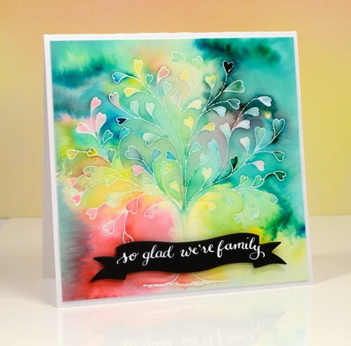 I wanted the area around the flowers to be completely covered in paint so I blended some areas with a paintbrush. Around the edges I left it abstract. The panel was very tall and thin so I ended up with a tall thin card finished with a sentiment popped up over the flower stems.