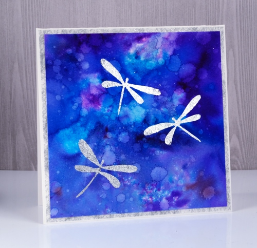 Posted: May 26, 2017 Filed under: Flutters, Gilding Flakes | Tags: color burst, Fabriano Watercolour Paper, Gilding, Penny Black creative dies 9 CommentsMy second gilded card also features dragonflies, this time little silver ones. In my previous post I shared a card gilded in both gold and silver flakes; this time I just used silver because I think silver and blue look so very pretty together. I used stick it adhesive once again to attach the gilding to the watercolour panel and colorburst powders to create the background panel.