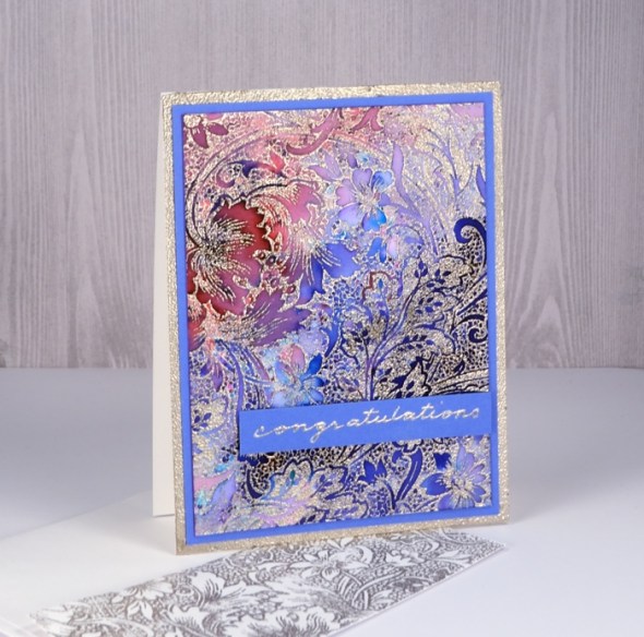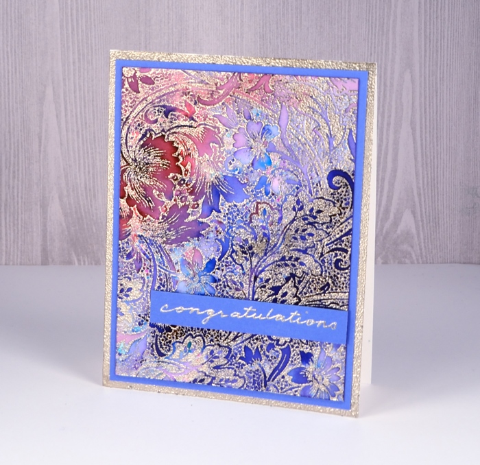 I embossed the ‘Effulgence’ stamp on hot pressed watercolour paper in clear powder then sprinkled ultramarine and violet colorburst powders over the panel. I spritzed the panel from above and watched the colour move before adding any more powder or water.