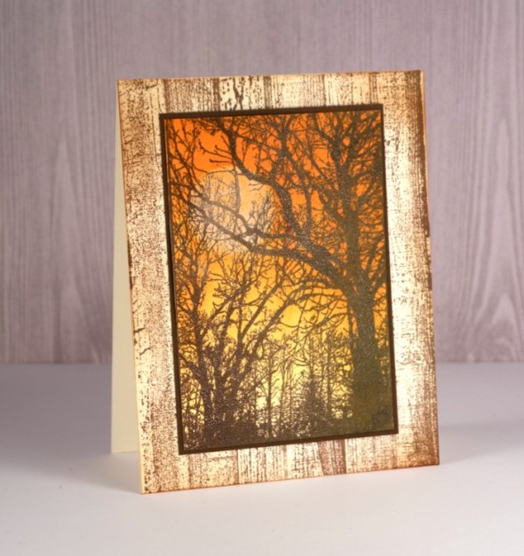 Posted: February 20, 2018 Filed under: French Script, Woodgrain, Woodlands | Tags: color burst, Darkroom Door stamps, Ranger Distress inks, Tsukineko Versafine inks, WOW embossing powders 4 CommentsI had a lovely time with this new photo stamp from Darkroom Door. It’s called Woodlands and was perfect for creating an autumn scene, a winter scene and a sunset. Step by step instructions and a complete list of supplies are available on the Darkroom Door blog