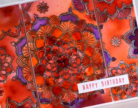 I stamped my design in versamark but I probably should have gone for a coloured ink (duh!) as I was embossing in gunmetal powder anyway. I stamped the individual mandala circle stamps one at a time on hot pressed watercolour paper and embossed after each stamping. If I had used a coloured pigment ink to see where I had stamped I probably could have stamped several before stopping to emboss with the gunmetal powder. After I’d done all my embossing I sprinkled tangerine, violet and fuchsia colorburst powders over the panel and spritzed with water. I try not to sprinkle too much the first time so I can see where each colour has fallen and then decide if I want to feature a colour in a particular place. You can see from the close up that I did concentrate some areas as violet, some as tangerine and others as a blend. To keep a section as one colour I started moving and adding colour with a paintbrush instead of sprinkling it from the bottle. I used my glass mat as a palette and mixed some of each colour on the mat so I could then paint it into sections on the panel. Once all the painting was done I dried the panel and painted diamond glaze over several of the mandalas. You can probably see a reflective shine on parts of the top two photos, that’s the glaze.