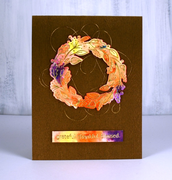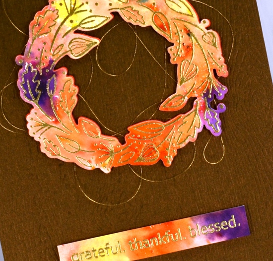 I sprinkled four colours of Ken Oliver’s colorburst powders over the embossing then spritzed with water and watched the colours emerge and spread. I helped them out a little with a paintbrush so paint filled every nook and cranny. Once the panel was dry I die cut the wreath and trimmed the sentiment to the right size then cut a wreath from adhesive backed foam also to pop up the watercoloured one. Before I attached the wreath to the card base I looped some gold embroidery thread back and forth around the wreath letting the adhesive hold it in place.