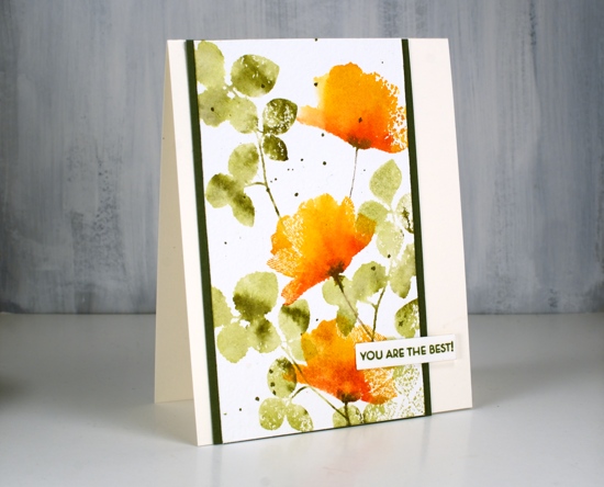 Once all those flowers were done I thought about the sentiment. I know I should consider the sentiment earlier in the process but I rarely do. I didn’t want to cover up too much of the design so I went for the subtle stacked letter die look. I cut the letters b e s t out of the panel and three more of each from blank watercolour paper then stacked them up and attached them on the card. I did some stamp surgery to separate ‘you’re the’ from one of the sentiment stamps in the ‘filled in florals’ set and stamped in versamark ink so I could emboss in white powder. The sentiment is fairly subtle when you look straight on but the recipient will be able to see and feel the texture of the raised letters.
