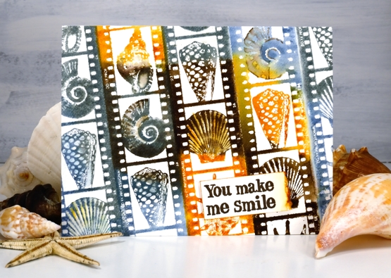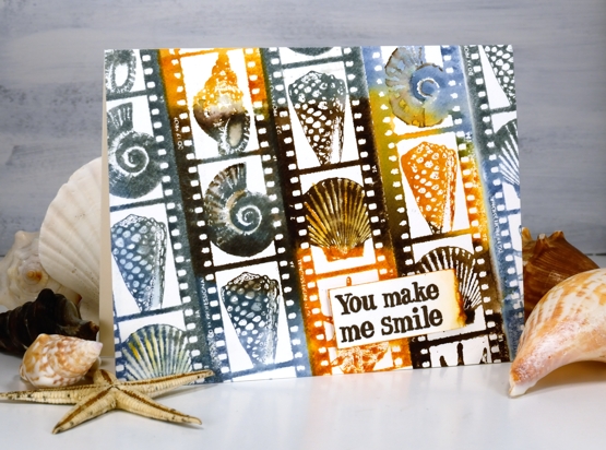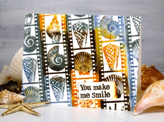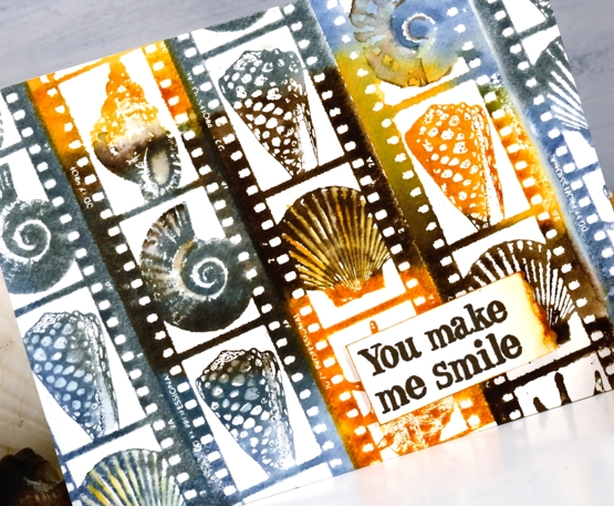 I stamped the large shells first making a mask for each one out of a post it note so I could before stamping a second or third shell and mask all three when I stamped the repeated filmstrip background. The large shells I stamped first in archival ink then over the top in distress ink which I blended to fill and add shading to the shells. The background I stamped in tea dye distress ink using the MISTI to keep the stamp in place and move the watercolour paper panel. After stamping the background I blended over the top with a paintbrush and water and dabbed away liquid to halt the blurring so I could still see the shell images.
