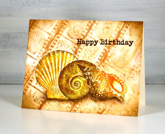 Before you wonder why a seashell card has popped up right after a snow covered bell card remember that not everyone is heading into winter right now. I can wistfully look at these seashells and wish I was entering an Australian summer and that wistfulness would not just be about the weather! Speaking of Australia, this stamp is from Darkroom Door and is one of their new filmstrip stamps.