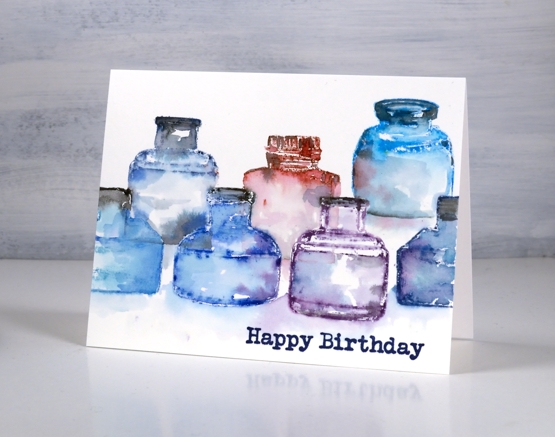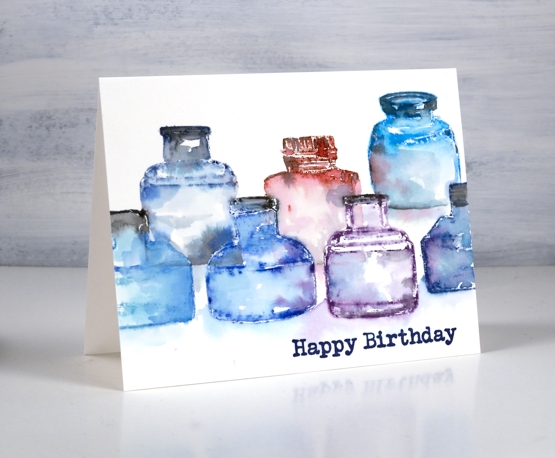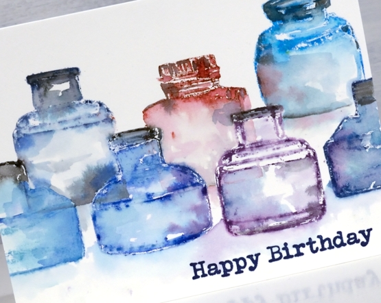 I wanted to end up with a loose watercolour sketch of ink bottles. I worked on hot pressed watercolour paper with distress inks as my ‘paints’. I did not really plan my process at all and realised a few things about the stamps a little late but it turned out fine in the end. Next time I play with these stamps I might try putting the pens in the inks, and creating different colours of ink in the bottles. Ahh, so many possibilities.
