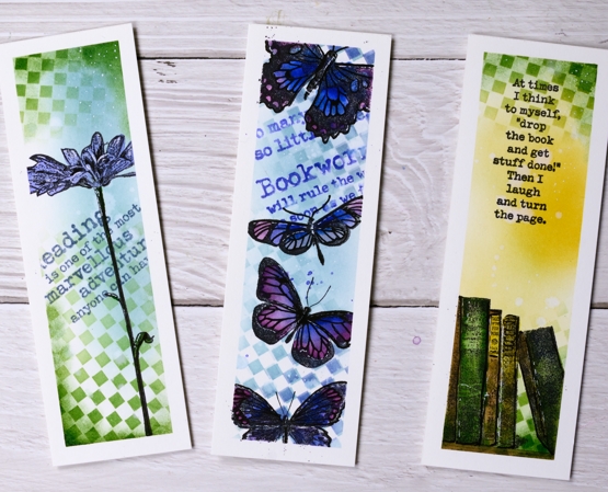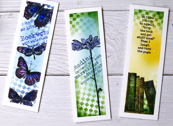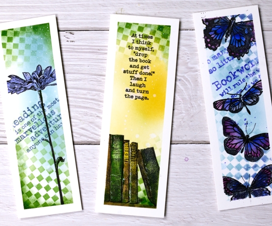 I taped a piece of watercolour paper to my glass mat using washi tape and the grid on the mat to keep the tapes even as they divided the panel into three strips. I blended distress inks through the Darkroom Door small checkered stencil onto the panel, two colours for each strip then blended more ink to fill the spaces. I chose a different theme for each bookmark but used reading quotes from the Darkroom Door ‘Bookworm’ set for each one. (all the stamps and inks are listed below)