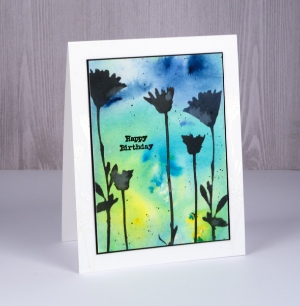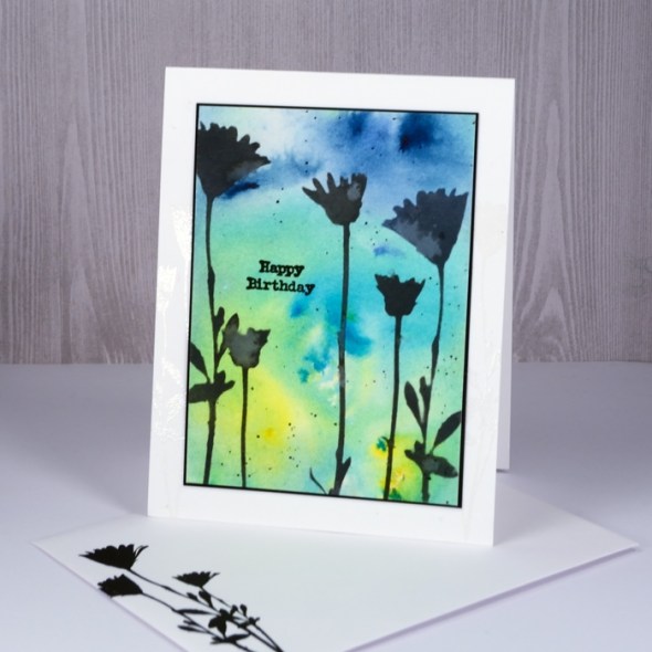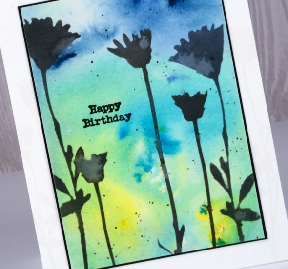 I’ve been pairing stencils with a few different things lately. For today’s card I sponged through the Darkroom Door stencil, wildflowers, with black soot distress oxide ink. You can see the watermarks on the stenciled flowers, a chalky white effect particularly obvious with the oxide inks. But before I did that I began by sprinkling brusho over a panel of watercolour paper. I spritzed with water and let the patterns happen. Once that was dry I sponged the black soot oxide through the stencil then splattered some droplets of water on top. I dabbed them up fairly quickly to create the watermarks.