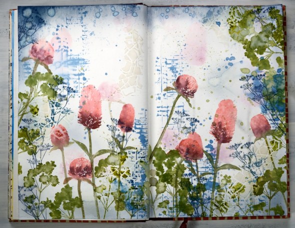 At this point I considered the background complete and started on the more distinct stamping. As I was working in the journal I couldn’t place it in the MISTI so I placed my ‘staytion’ magnetic board under the left hand page and added some acrylic blocks underneath the board to balance the left side of the journal with the right. I used an acrylic block to stamp all the clover and positioned a stampa-ma-jig against the block a couple of times just in case I didn’t have a complete image. I was able to do touch ups with a paintbrush and extra ink if the stamping was too pale.