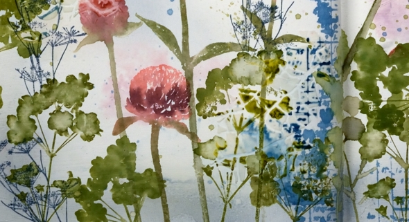 I kept my colour scheme with the addition of more green and added a few extra stamp images and a bit of texture. I used a Fabriano ‘Venezia’ art journal, with drawing paper not watercolour paper. The weight of the paper is decent but if I’m going to be spritzing and adding water and ink I paint a layer of absorbant ground on both pages first.