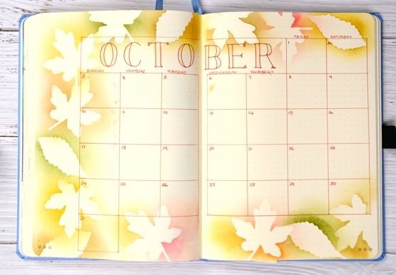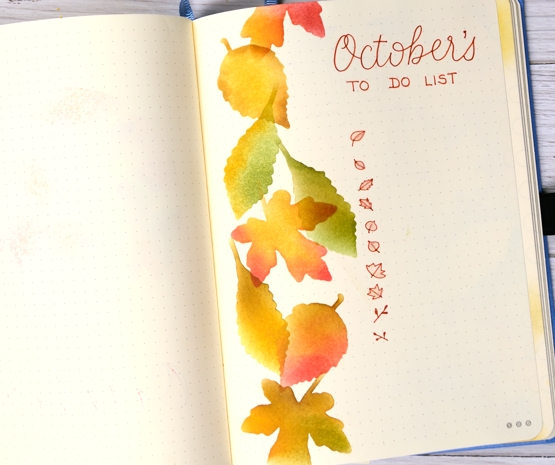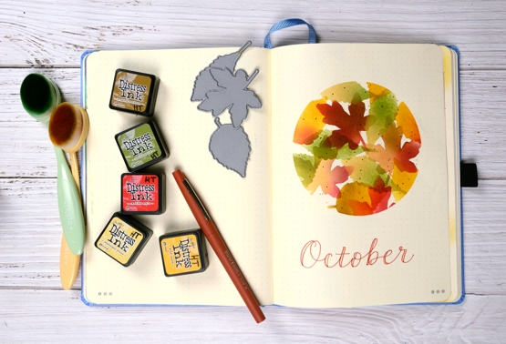 I had no trouble choosing a theme for October in my bullet journal, would it be leaves, leaves or leaves? I die-cut a surround circle mask to protect most of the page, a technique I used in August, April and January. I cut leaf masks from post-it notes using the ‘autumn jewels’ dies from Penny Black.