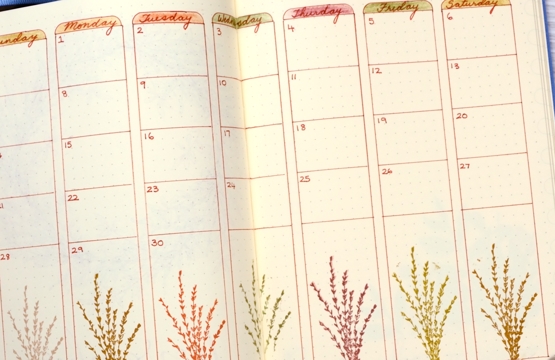 The to-do page and the calendar page have simple foliage stamping and some lettering with Pentel Flair pens.