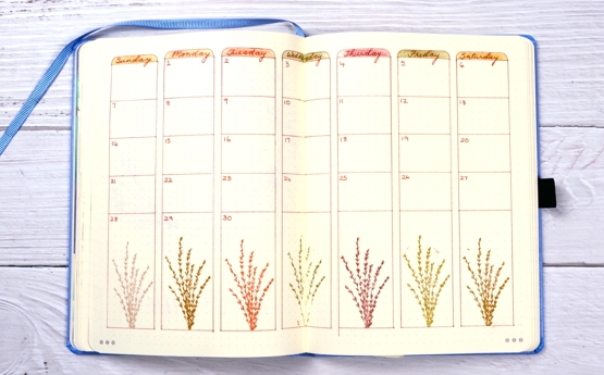 For the calendar page I stamped the same grass stamp in a different colour for each week day and added coordinating labels at the top of each column.