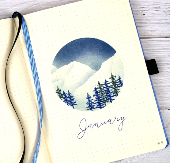 This is my January title page; I know it’s almost February and I should be sharing the Feb page but I will catch up and start sharing ahead by March (I hope). I’m going to have a different theme for each month, otherwise I would get sick of them I’m sure. The January theme as you can see was mountains and trees. Start with what you know, right?