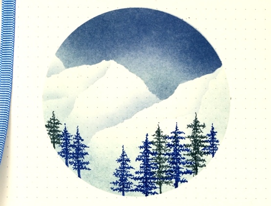 I die cut a 3¾” circle from a large post it then tore some more post-it edges to mask mountain tops while I blended a blue sky with chipped sapphire and stormy sky distress inks and blending brushes. Not too surprising that I would pick my favourite blue distress inks for my first theme. After blending the dark sky I turned the torn edge of the post it on its side to blend shadows on the mountain sides with stormy sky ink. I drew the trees with a Stabilo point 88 dark blue and a Papermate flair grey.