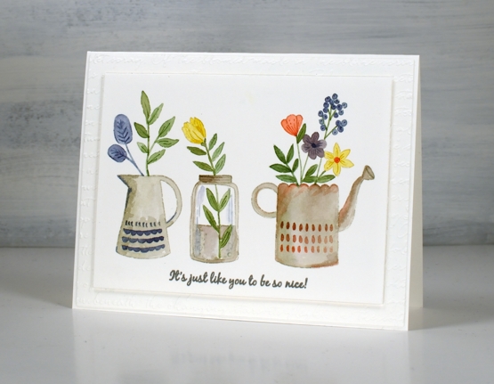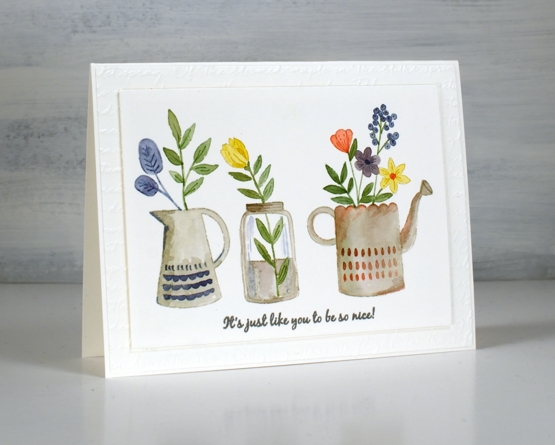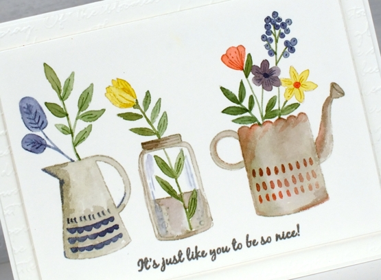 Inspiration for today’s card came from a watercolour artist I saw on Instagram. Her name is Garima Srivastava and she paints loads of florals sometimes in cute little jars and vases. I saw one of her paintings then pulled out the new Penny Black ‘garden fresh’ clear set to create my own little trio.