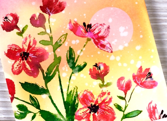 I made sure the panel was totally dry before putting it in a stamp positioner to do a bold focal print. I used the same colours berry sorbet for petals, orange zest for centre and prairie grass for leaves and stems. I stamped a second time adding aged mahogany shadows on the flower centre and abandoned coral definition on the petals. I did some blending with a paint brush but not on all the stamping.
