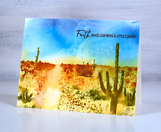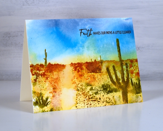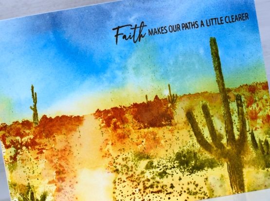 You can see my finished design doesn’t contain fine details but the overall feeling is a hot day in the desert day among some bold contrasting scenery. I finished the card with a sentiment from the PB ‘Faith.Hope.Love’ set.