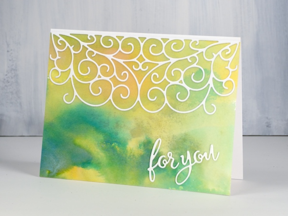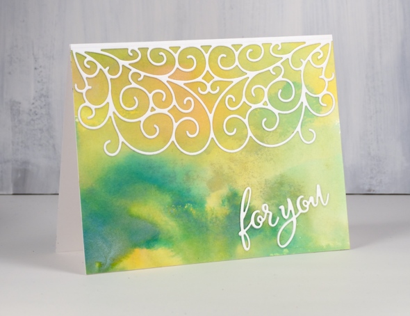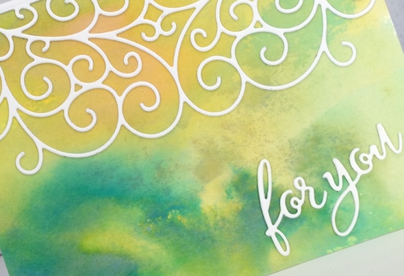 For this card the oxide inks were wild honey and lucky clover. I topped the panel with the scrolls half edger die cut and a stacked sentiment. I backed the white cardstock with adhesive sheet first before cutting to make it easier to attach.