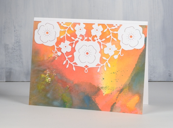 The second background was made by swiping watercolour paper through wild honey, lucky clover and abandoned coral oxide inks then splattering some more ink and water over the top.
