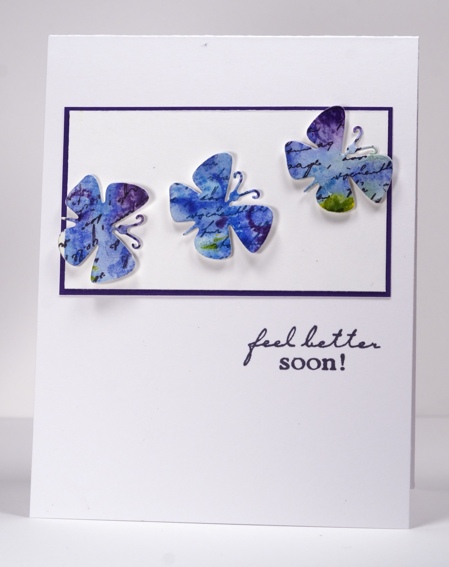To create today’s card I played with two new toys: the Flutters creative die from PB and the Faber Castell gelatos. I coloured and blended the gelatos with water on water colour paper. I wasn’t trying to make a pattern just a pretty blend of blues with a few yellow highlights. After die cutting the butterflies I added the letter background stamp over the top. The most time consuming part of this card was trying to arrange the butterflies; I actually had five that I was fiddling with but I ended up leaving the two big ones out. Maybe they will turn up another day.