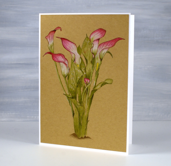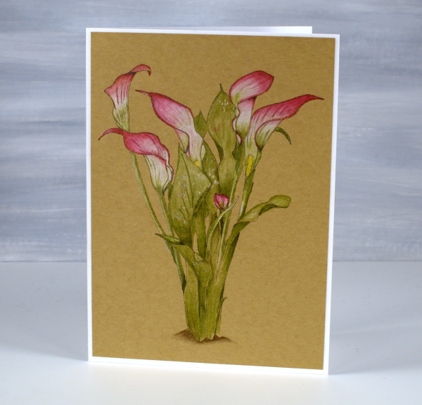 Time for new digital stamps from Echidna Studios and these two, Calla Lilies, are stunners. Once again my daughter drew the designs from one of her own photos. I printed this first one on kraft paper and coloured it with Faber Castell polychromos pencils.