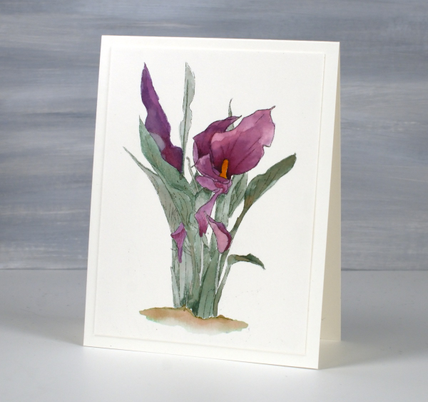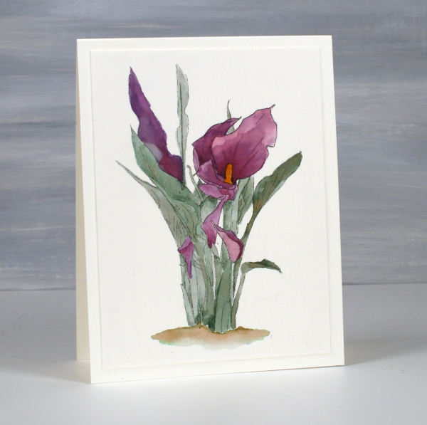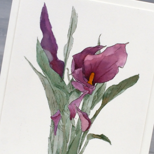 I used watercolour techniques to paint the second lily design after printing it on hot pressed watercolour paper.