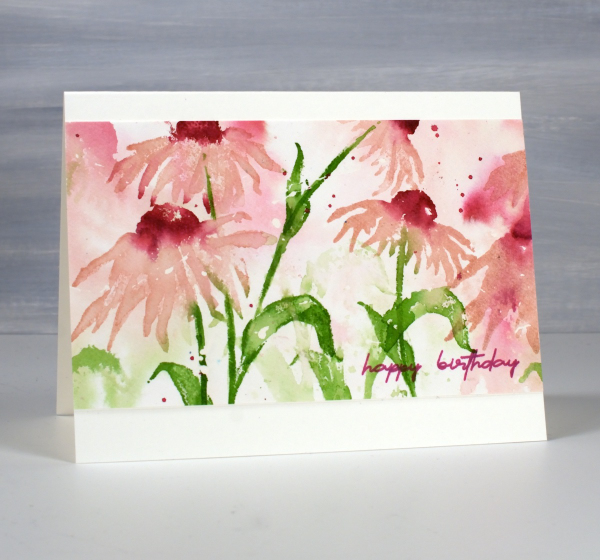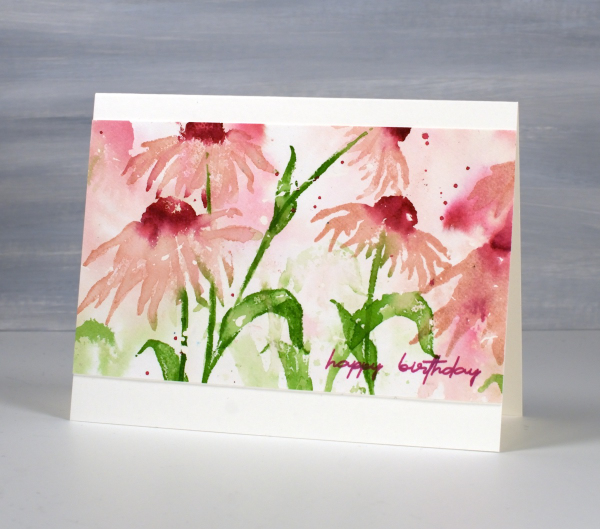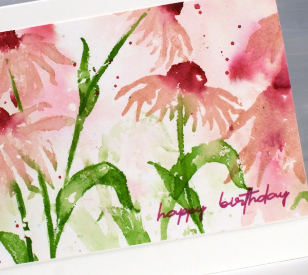 I created this panel on hot pressed watercolour paper a few years back as added inspiration for my Floral Faves online class but it was sitting in a folder not being enjoyed. I recently trimmed the ends off, turned it into a card and it is on it’s way to a friend for her birthday.
