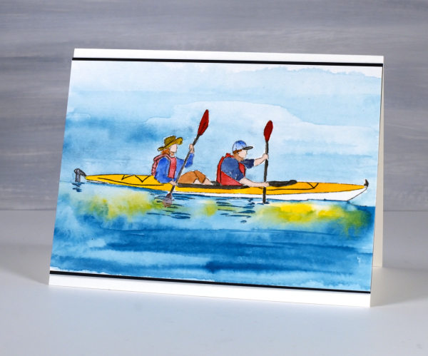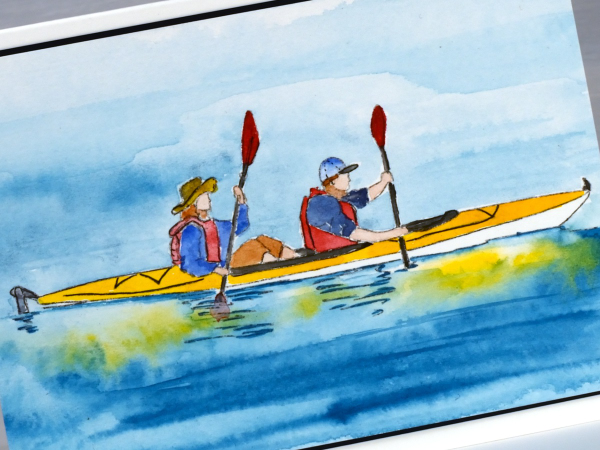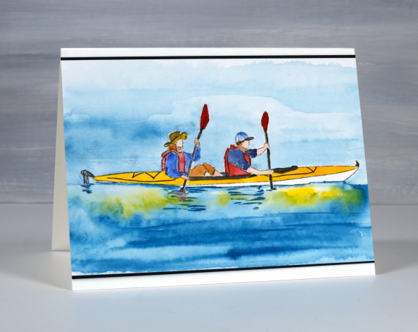 This two-person kayaking image is one of the digital designs in the ‘Gone Kayaking‘ set designed by my daughter. The other image features a single kayak. I printed the image on hot pressed watercolour paper then painted it with Sennelier watercolour paints. I sometimes finish off a watercolour with a finetip marker adding fine lines or definition which might have got lost in the painting process.
